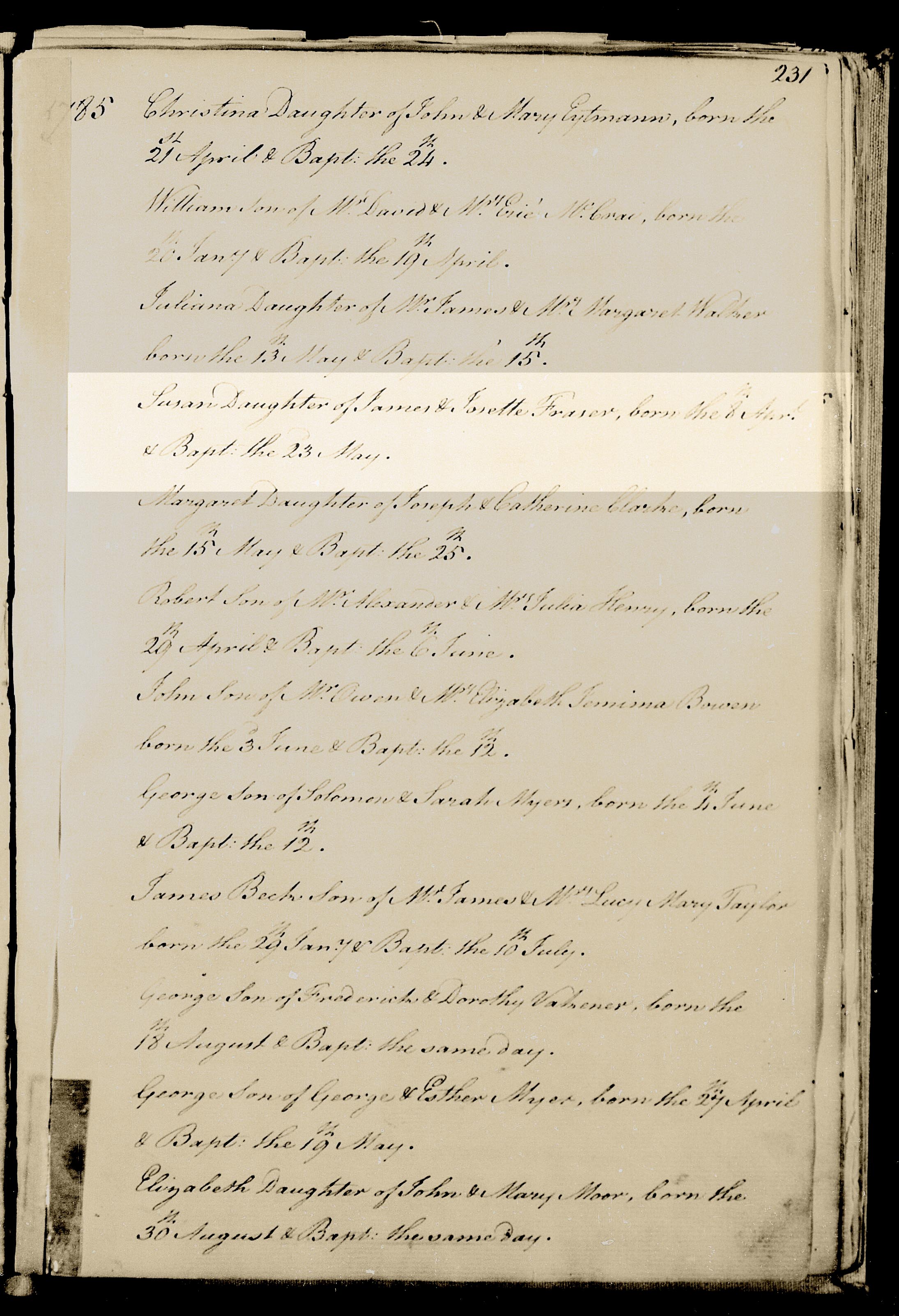 | Baptême d’une sœur | Susan FRASER 23 mai 1785 (Âge 13) Religion : Anglicane Publication : Collection du Fonds Drouin Qualité des données : source primaire |