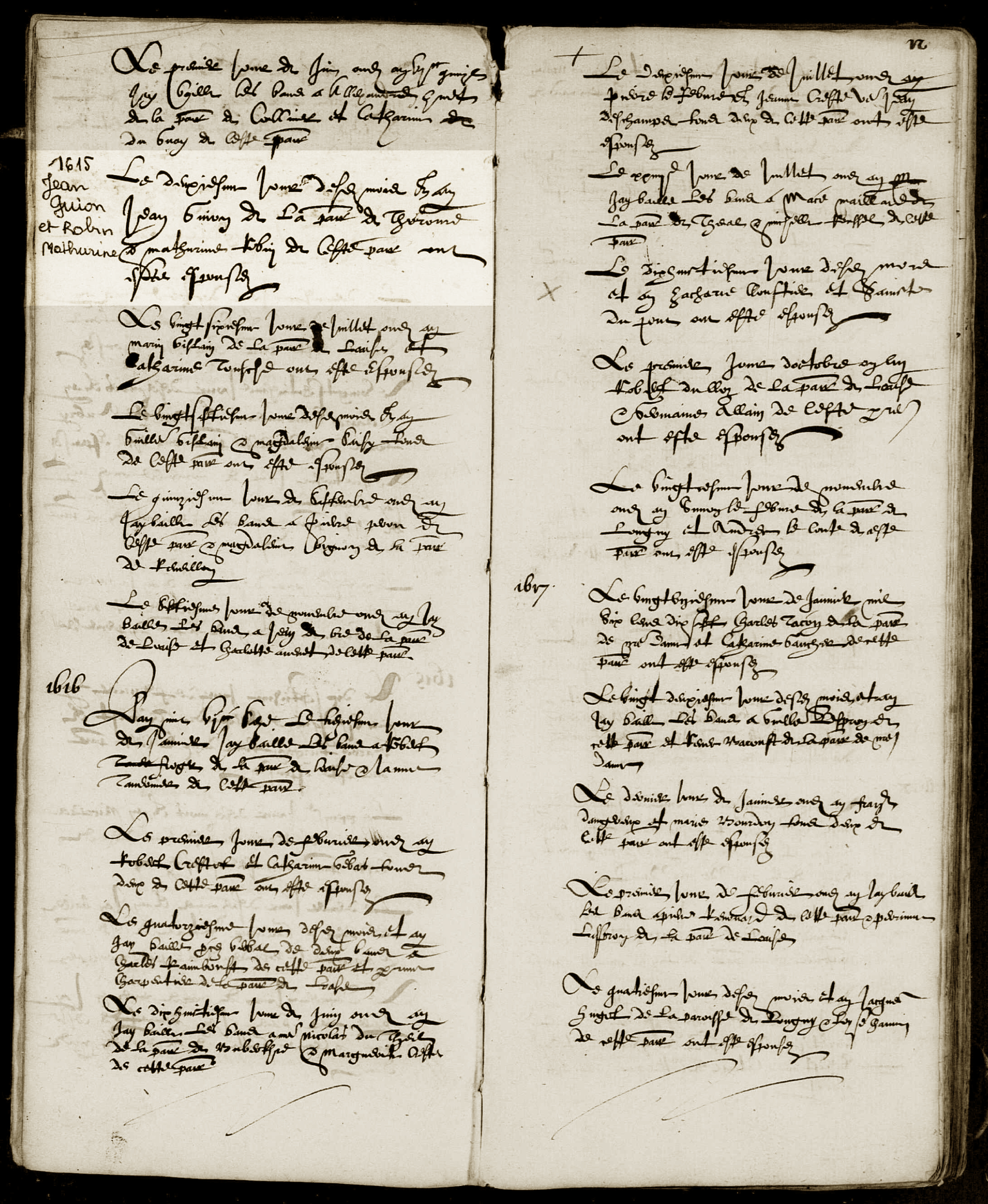 | Mariage religieux | Jean GUYON DU BUISSON — Afficher la famille 2 juin 1615 Religion : Catholique romaine Source : ACTES PAROISSIAUX, FRANCE, ORNE, MORTAGNE-AU-PERCHE, SAINT-JEAN-ET-SAINT-MALO, VOLUME 2 (MARIAGE AOUT 1601-SEPT 1635), FEUILLET 11-12 Qualité des données : source primaire |