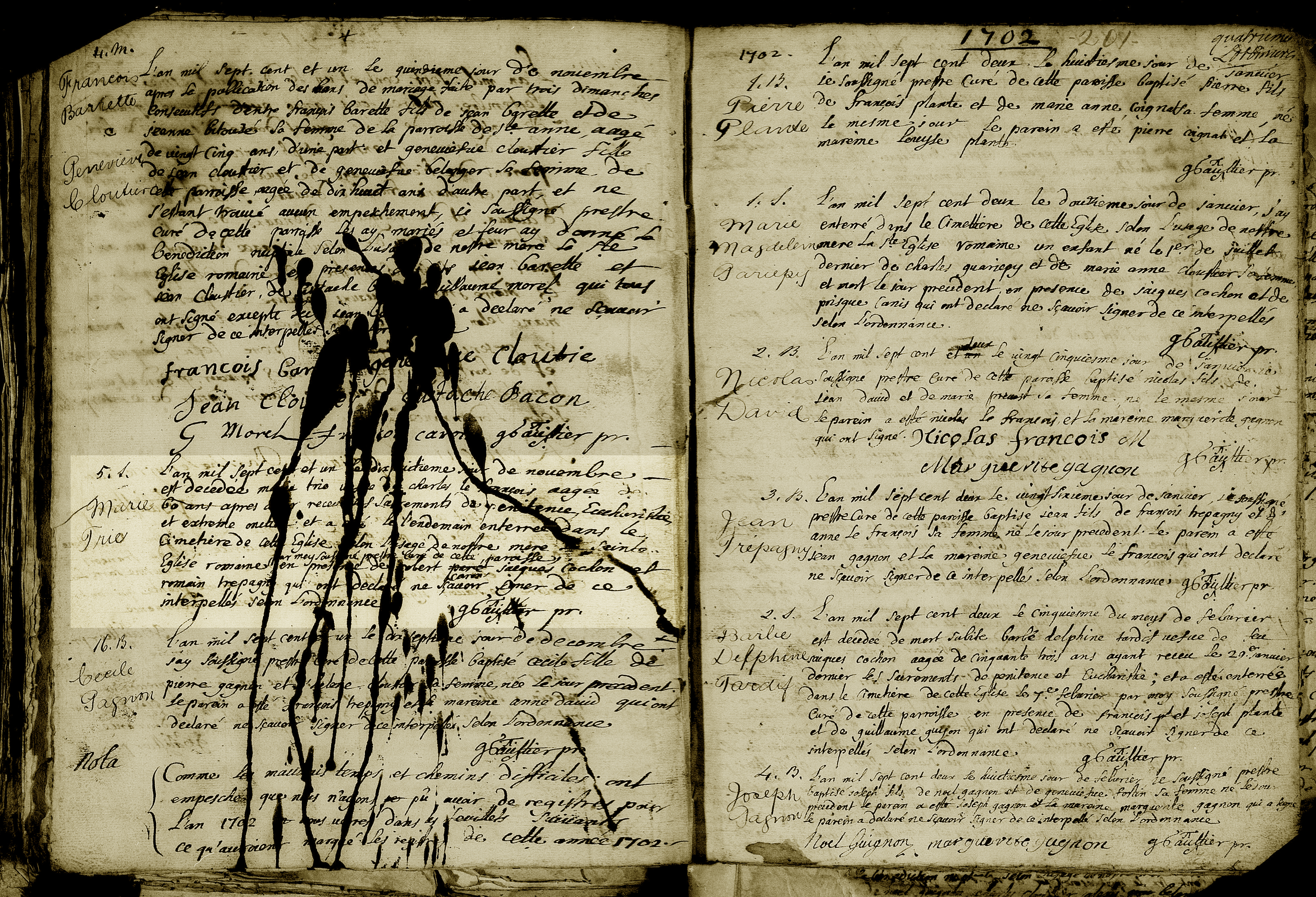 | Décès de la grand-mère maternelle | Marie Madeleine TRIOT 18 novembre 1701 Source : ACTES PAROISSIAUX, CHATEAU-RICHER, LA-VISITATION-DE-NOTRE-DAME, VOLUME 1 (1661-1702), FEUILLET 200-201 Qualité des données : source secondaire |