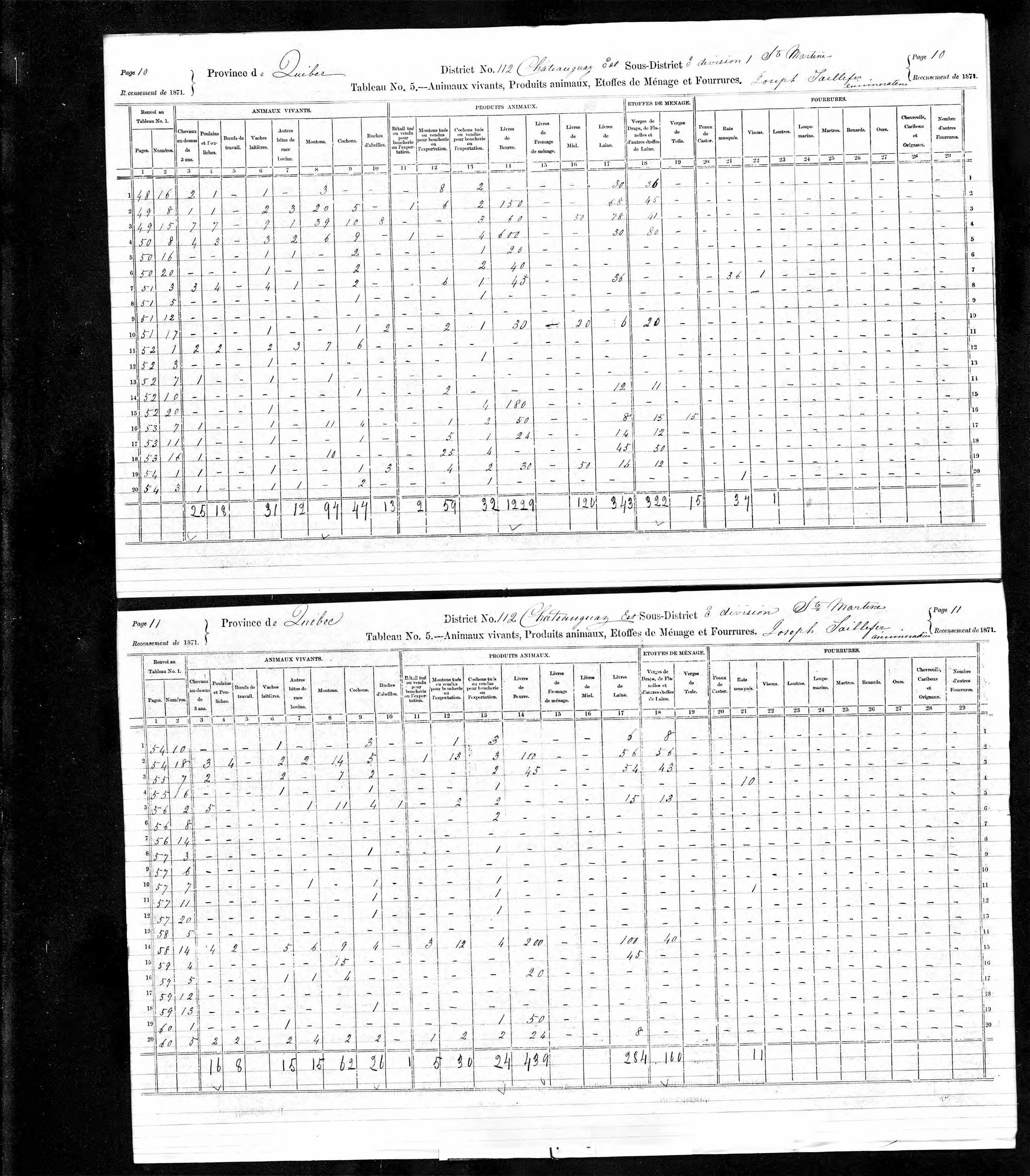 | Recensement du Canada 1871 | 1871 Qualité des données : source primaire Note : Placide Legault se retrouve au tableau 5, page 11, ligne 2: On y mentionne qu'il a 2 Vaches laitières et a produit d'ans l'année 100 livres de beurre