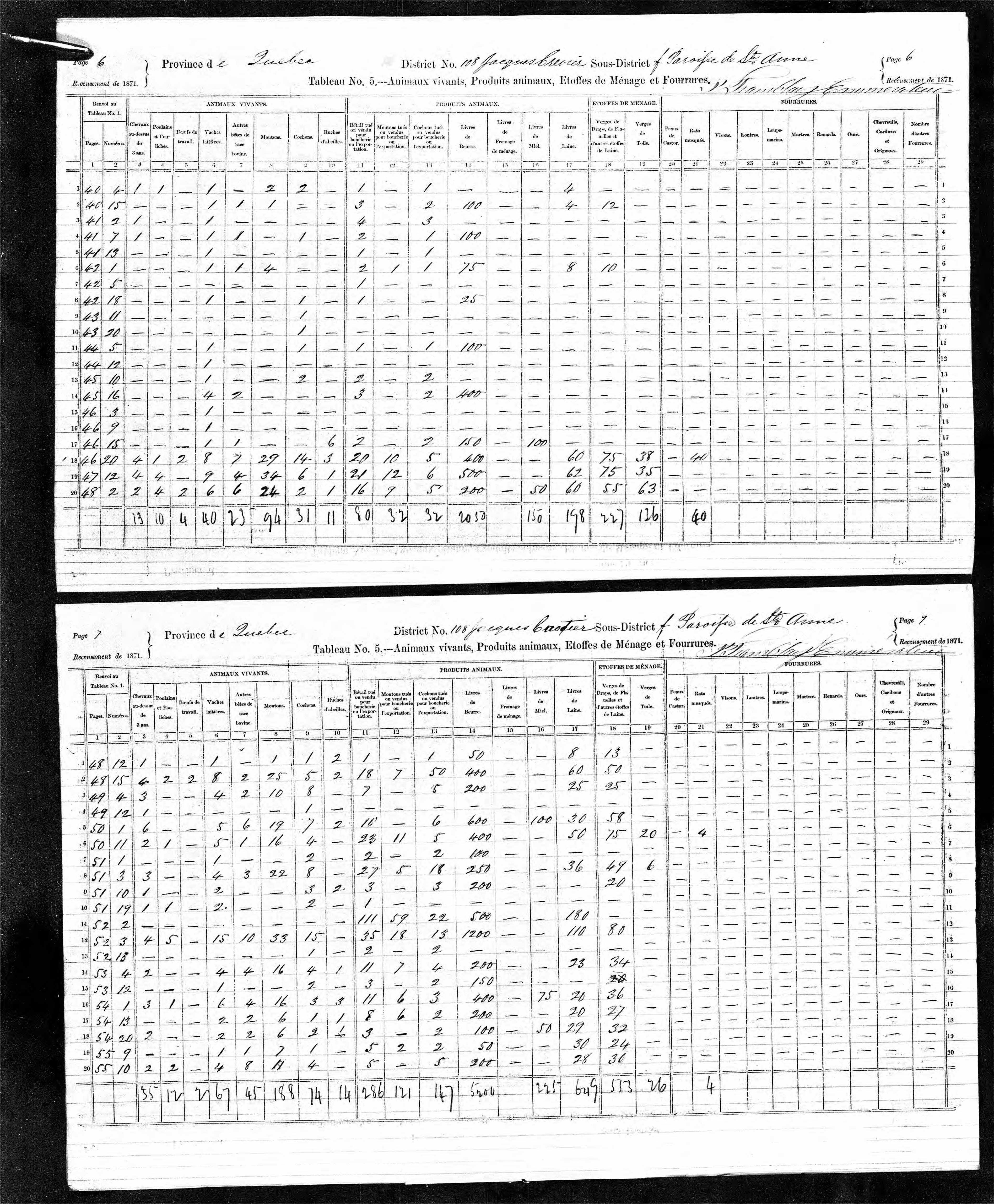 | Recensement du Canada de 1871, Sainte-Anne-de-Bellevue | 1871 Qualité des données : source primaire Note : François Lalonde figure au tableau 5, page 6, ligne 18 et on mentionne qu'il possède 8 vaches laitières et qu'il a produit 400 livres de beurre dans l'année