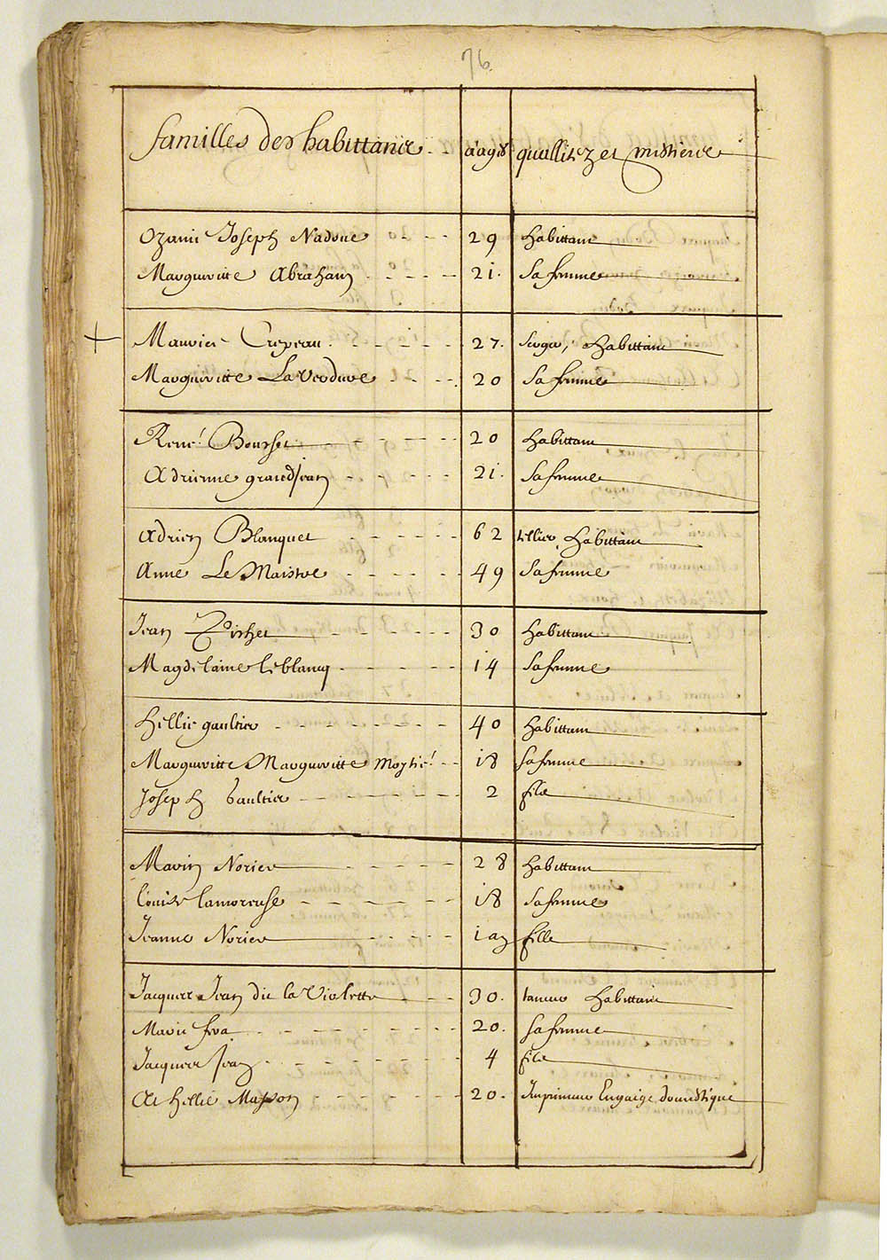 | Recensement | 1666 (Âge 20) Qualité des données : source primaire Note partagée : ÉTATS DES HABITANTS DU CANADA EN 1666, FEUILLET 76