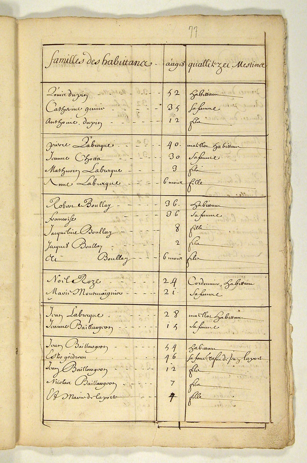 | Recensement | 1666 (Âge 41) Qualité des données : source primaire Note partagée : ÉTATS DES HABITANTS DU CANADA EN 1666, FEUILLET 77