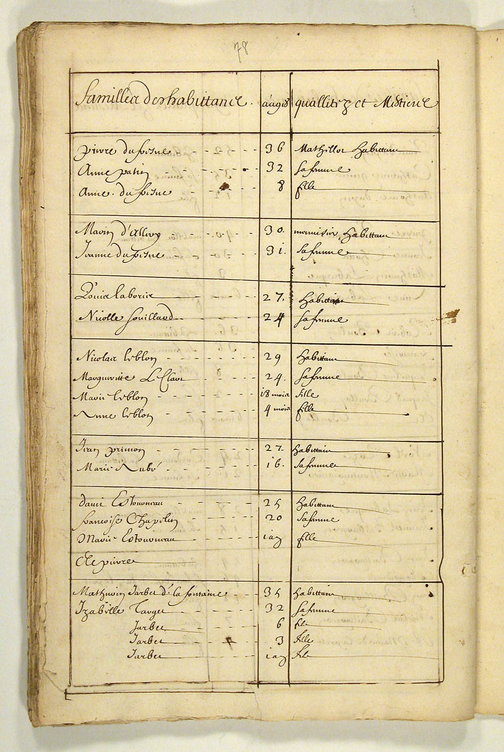 | Recensement | 1666 (Âge 14 mois) Qualité des données : source primaire Note partagée : ÉTATS DES HABITANTS DU CANADA EN 1666, FEUILLET 78
