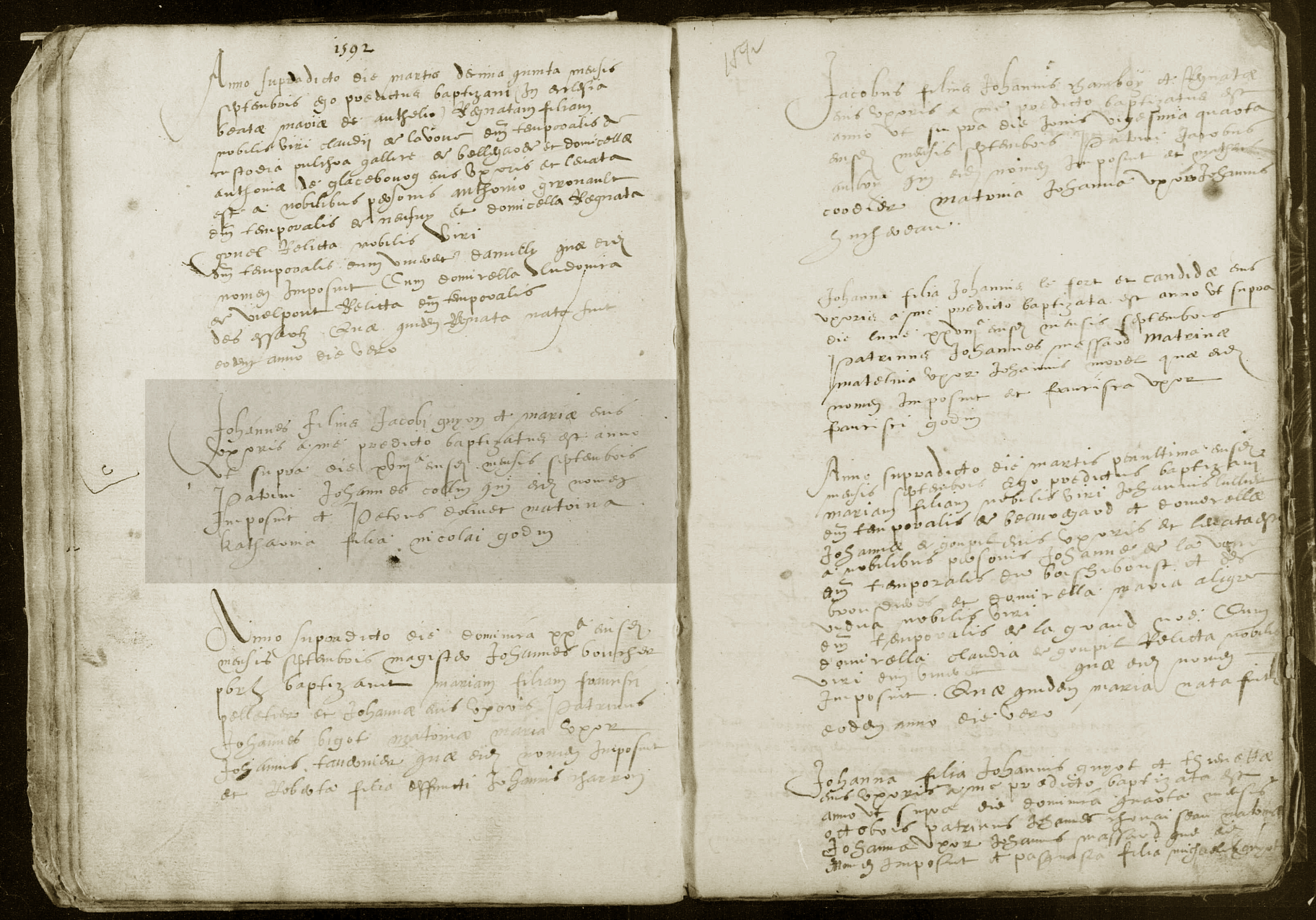 | Baptême d’un fils | Jean GUYON DU BUISSON 18 septembre 1592 (Âge 15) Religion : Catholique romaine Source : ACTES PAROISSIAUX, FRANCE, ORNE, TOUROUVRE, VOLUME 1 (BAPTEME 1588-MARS 1615 MARIAGE 1589-1600), FEUILLET 27-28 Texte : Johannes filius Jacobi Guyon et Mariae eus uxoris a me predicto baptizatus est anno at aupra die xviii eus dem mensis septembris patrini Johannes Collin qui eid nomen imposuit et Petrus Delivel matrina Katharina filia Nicolai Godin TRADUCTION Jehan, fils de Jacques Guyon et de Marie, sa femme a été baptisé par moi susdit l'an que dessus le 18e jour de septembre, parrain Jehan Collin qui a donné le nom et Pierre Dolivet, marraine Catherine, fille de Nicolas Godin Qualité des données : source primaire |