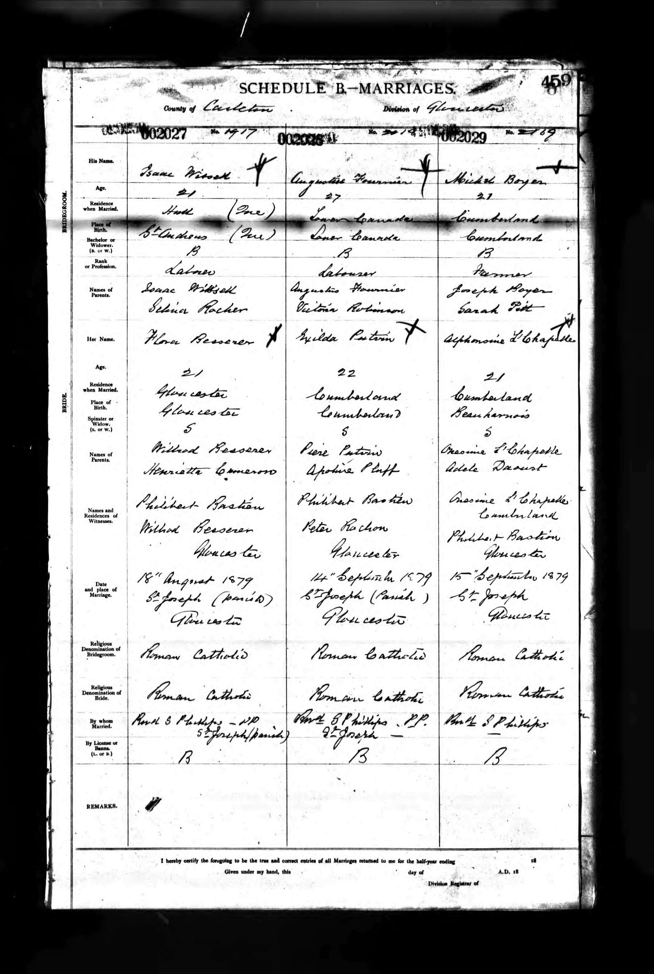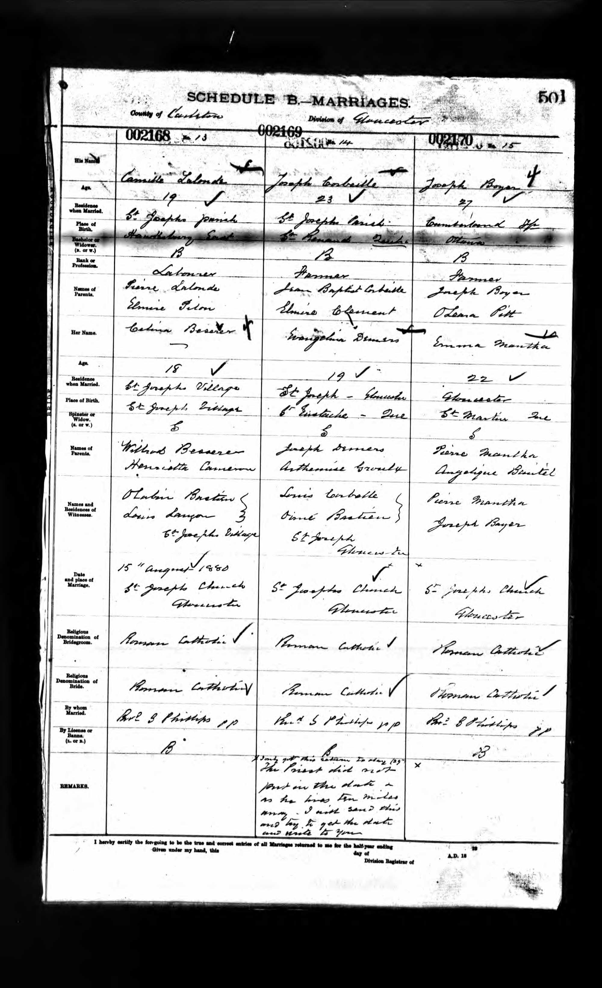 | Mariage d’un enfant | Michael BOYER — Alphonsine LACHAPELLE — Afficher la famille Type : Mariage religieux 15 septembre 1879 (Âge 59)Religion : Catholique Romaine Qualité des données : source primaire Qualité des données : source primaire |