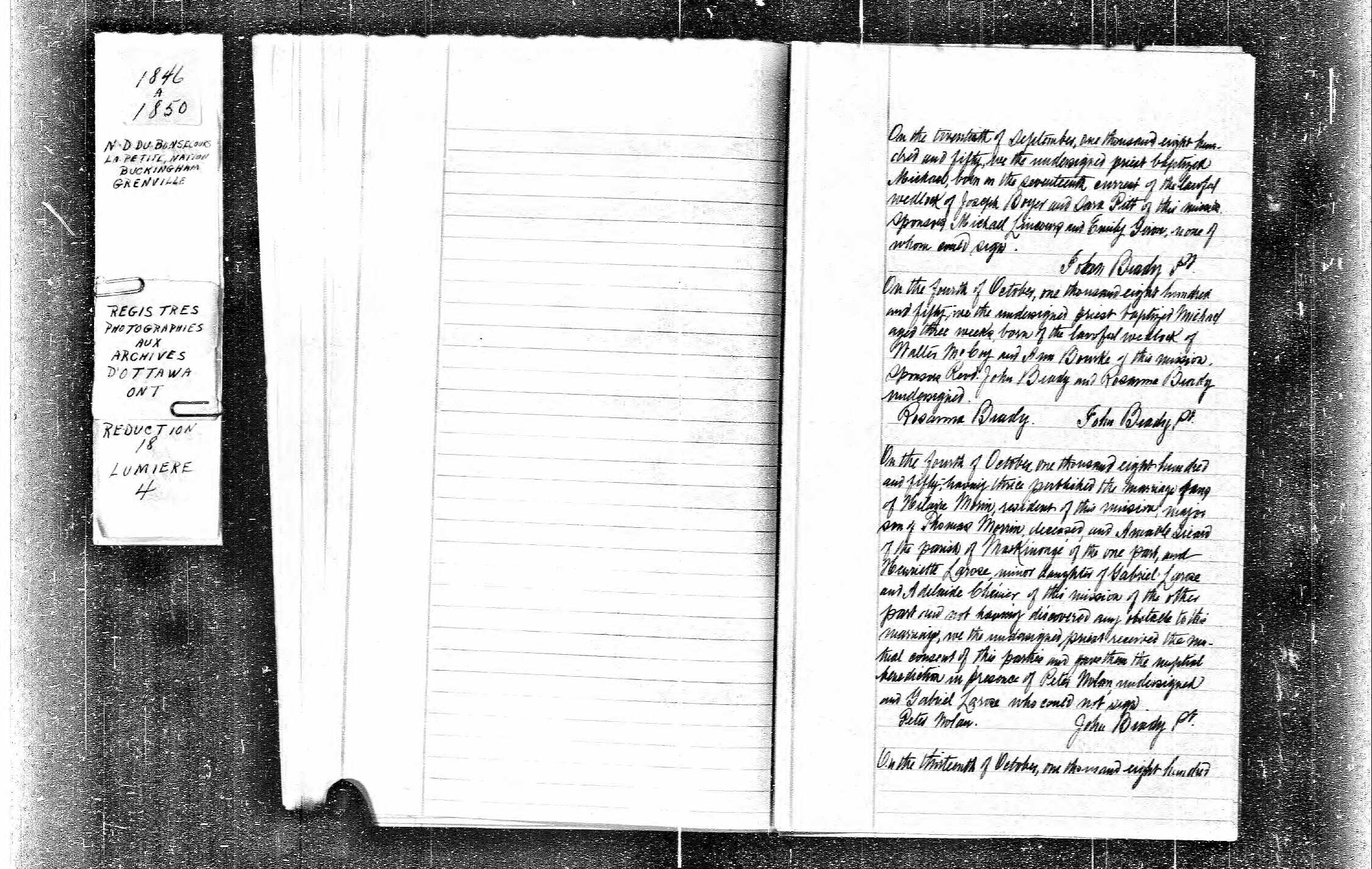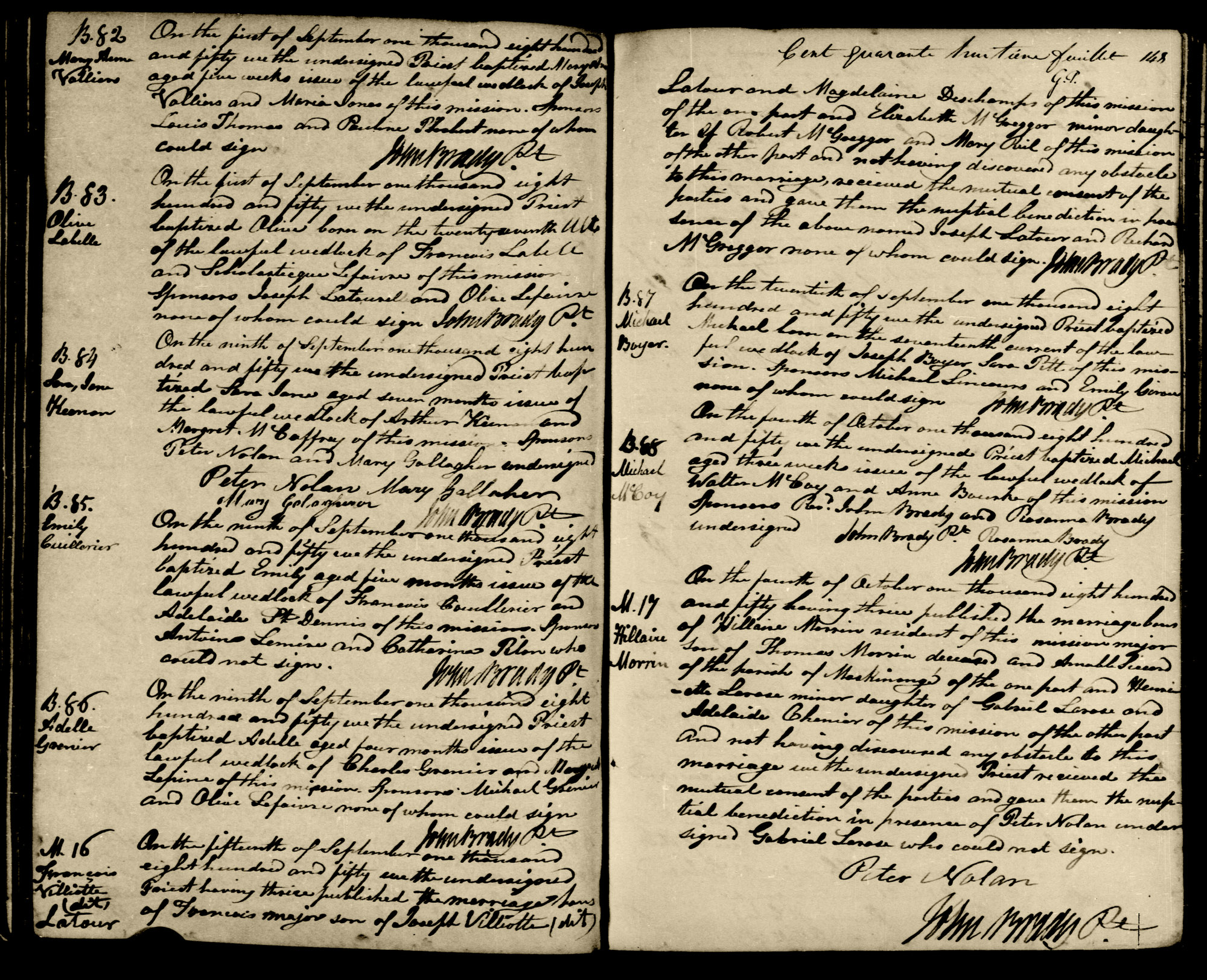 | Baptême d’un fils | Michael BOYER 20 septembre 1850 (Âge 30) Parrain : Michaël LINCOURS — Aucun lien de parenté Marraine : Emily GIRARD — Aucun lien de parenté Religion : Catholique Romaine Source : REGISTRE DE L'ÉTAT CIVIL, ONTARIO, NOTRE-DAME-DE-BON-SECOURS, LA PETITE NATION, BUCKINGHAM, GRENVILLE, VOLUME 1846-1850, FEUILLET 35 Qualité des données : source primaire Qualité des données : source primaire |