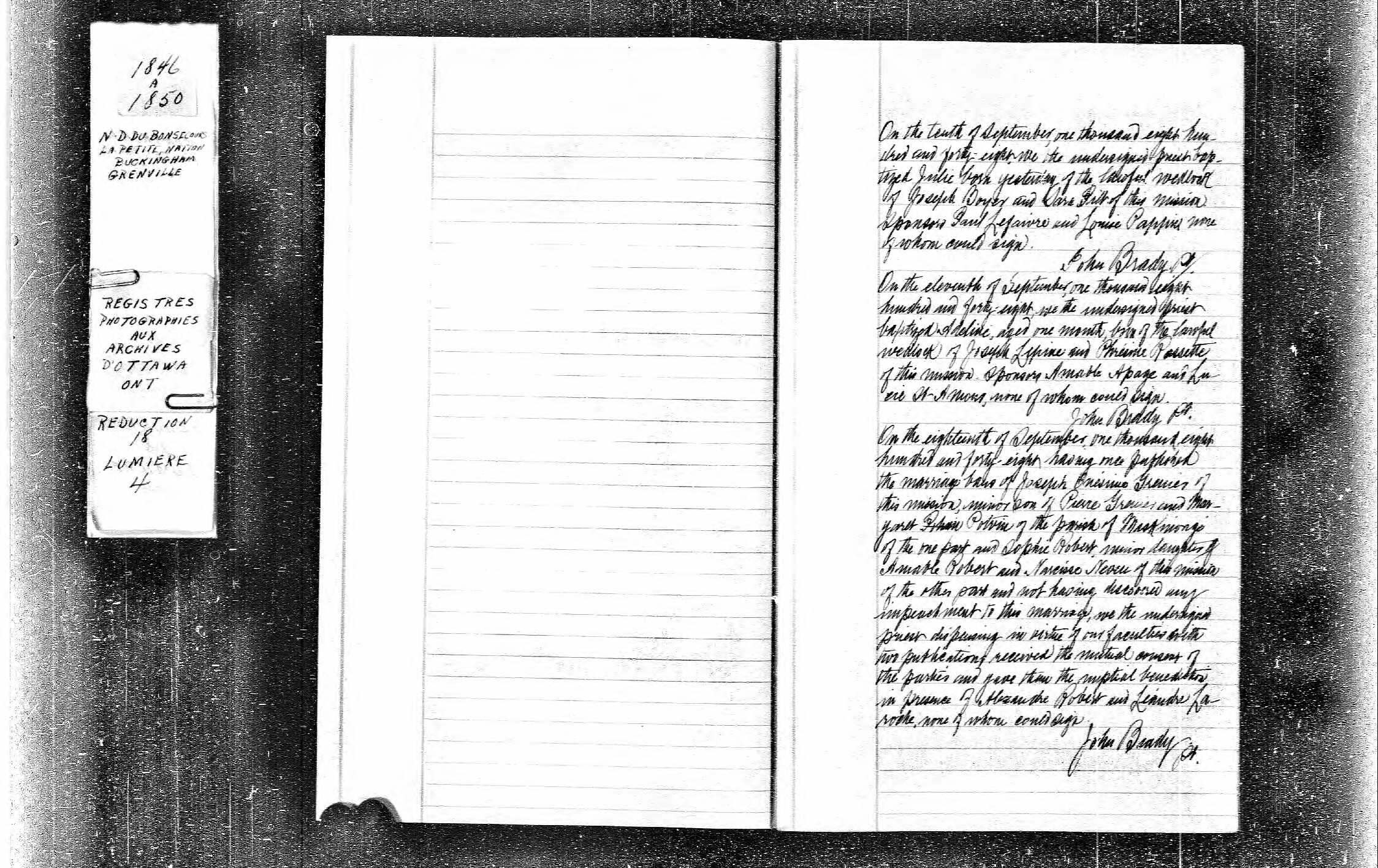 | Naissance d’une fille #1 | Julie BOYER 9 septembre 1848 (Âge 28) Source : REGISTRE DE L'ÉTAT CIVIL, ONTARIO, NOTRE-DAME-DE-BON-SECOURS, LA PETITE NATION, BUCKINGHAM, GRENVILLE, VOLUME 1846-1850, FEUILLET 63 Qualité des données : source primaire |