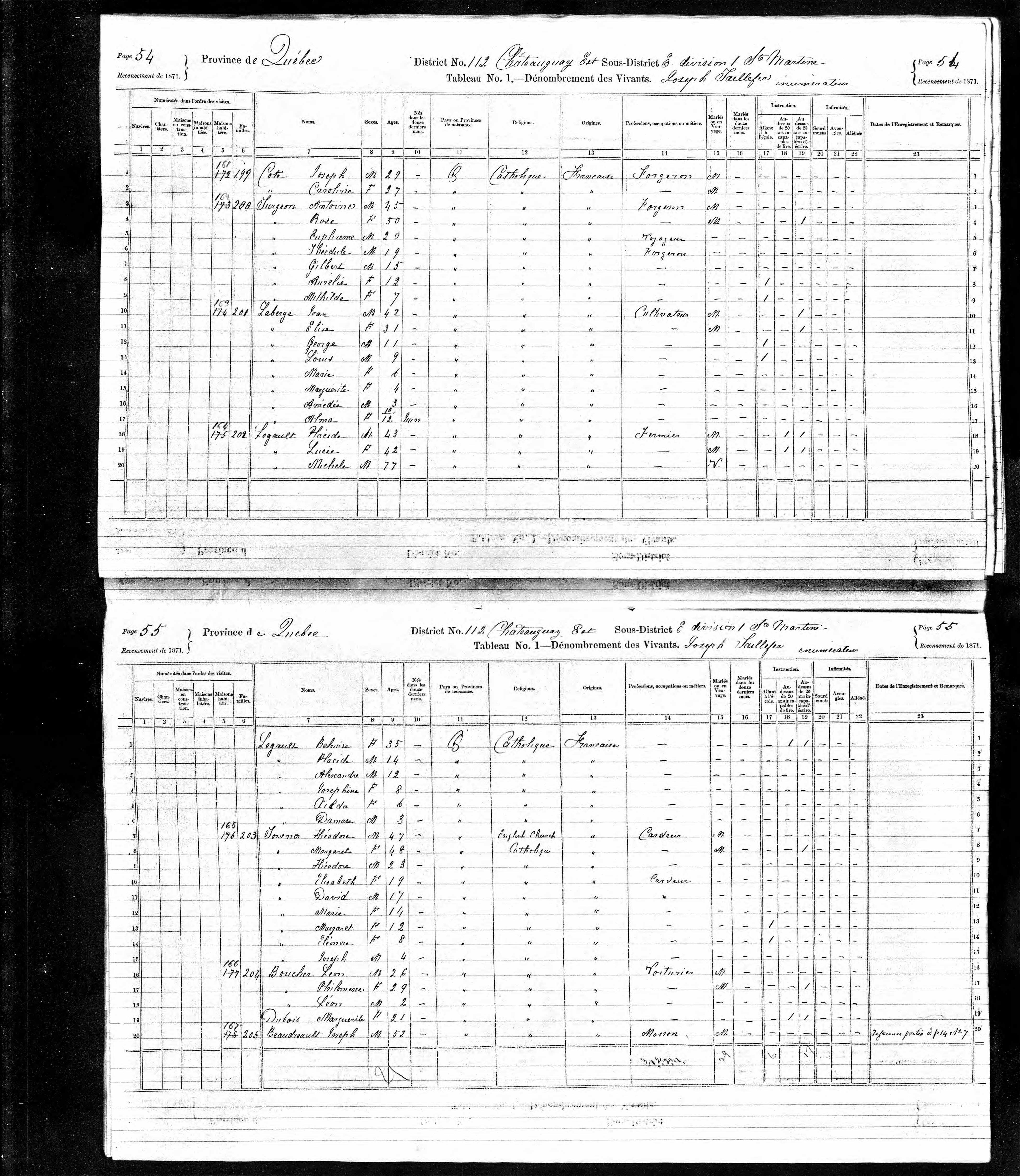 | Recensement du Canada 1871 | 1871 Qualité des données : source primaire Note : Placide Legault se retrouve au tableau 5, page 11, ligne 2: On y mentionne qu'il a 2 Vaches laitières et a produit d'ans l'année 100 livres de beurre