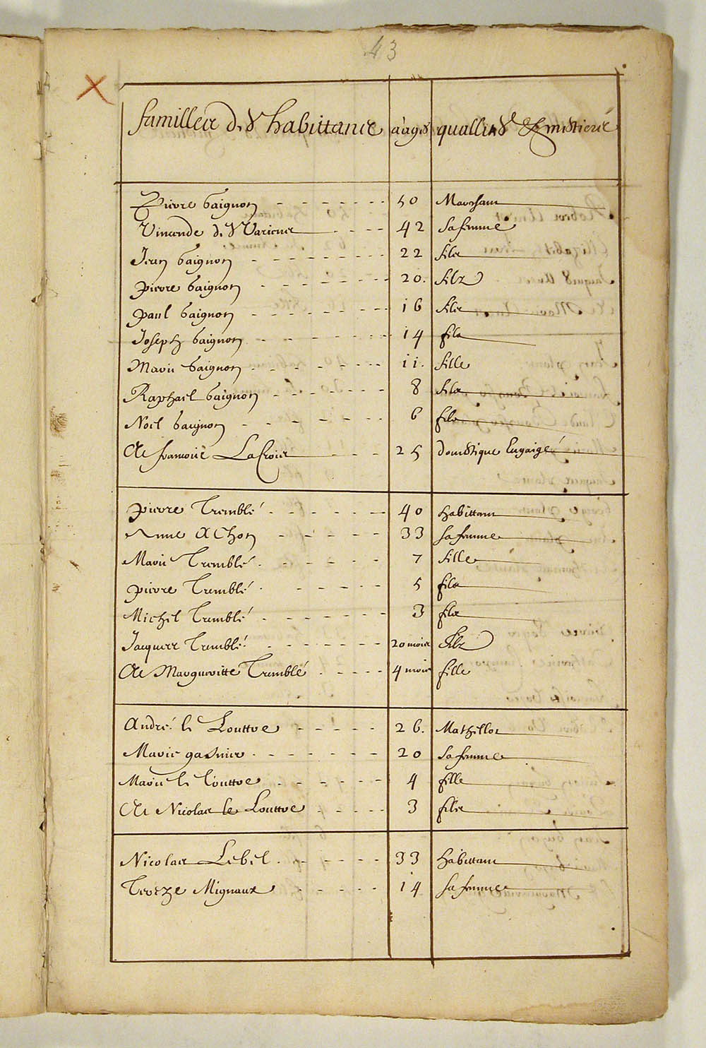 | Recensement | 1666 (Âge 10) Qualité des données : source primaire Note partagée : ÉTATS DES HABITANTS DU CANADA EN 1666, FEUILLET 43