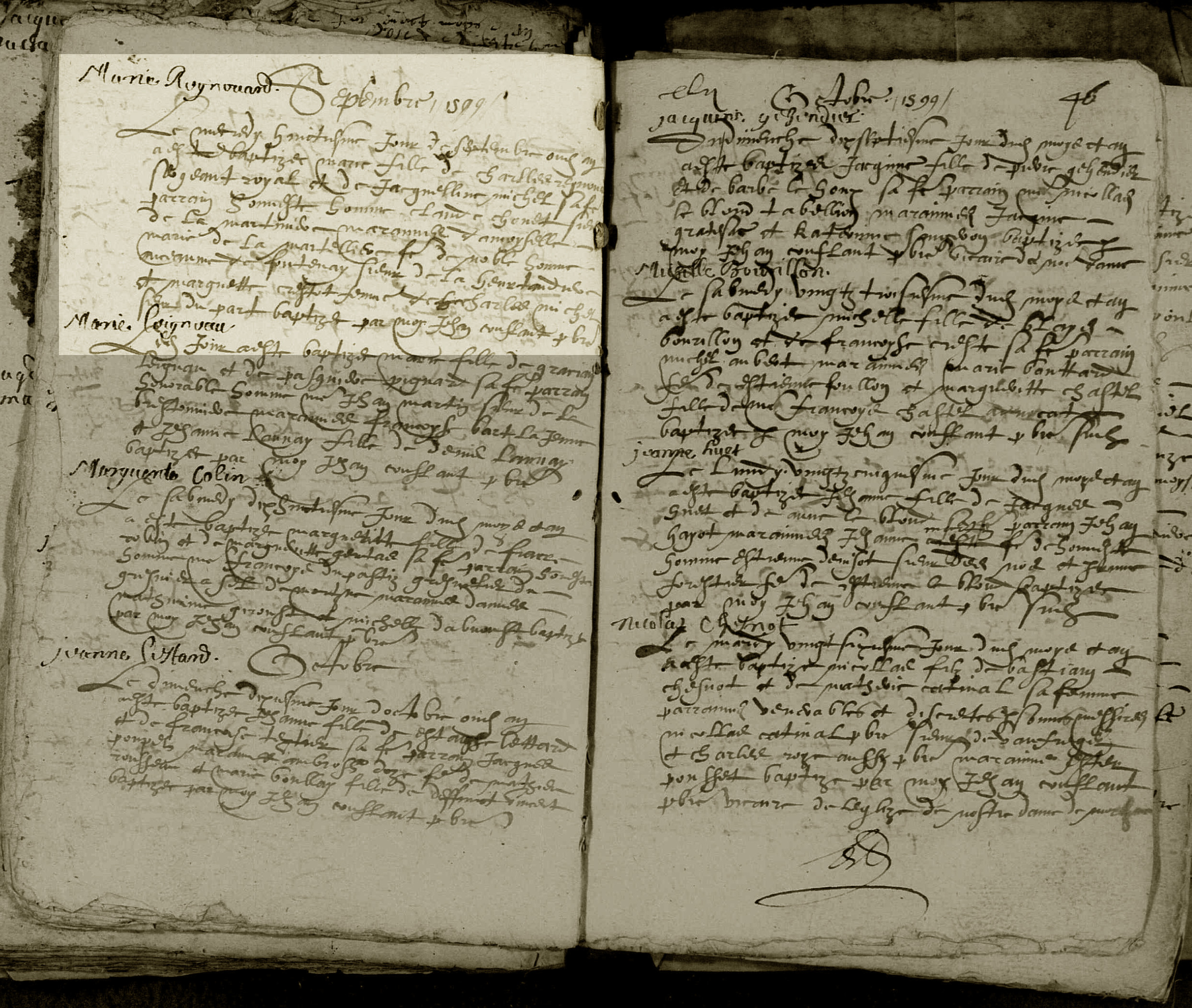 | Baptême d’une fille | Marie RENOUARD 8 septembre 1599 Religion : Catholique romaine Source : ACTES PAROISSIAUX, FRANCE, ORNE, MORTAGNE-AU-PERCHE, NOTRE-DAME, VOLUME 1 (BAPTEME AOUT 1587-1633), FEUILLET 47-48 Qualité des données : source secondaire |
